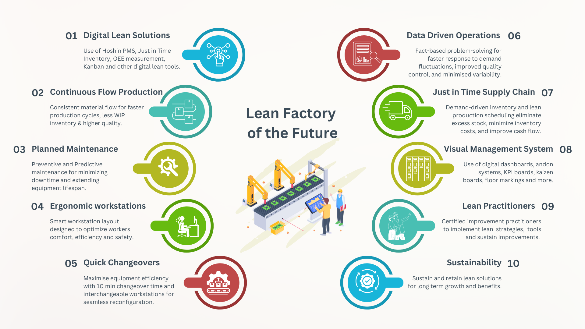 Our Lean principles and techniques build the foundation for the factory of the future, enabling manufacturers to adapt to competitive pressures and customer expectations rapidly. Those who successfully integrate these pillars will gain a significant edge in flexibility, customisation, faster delivery and higher product quality.